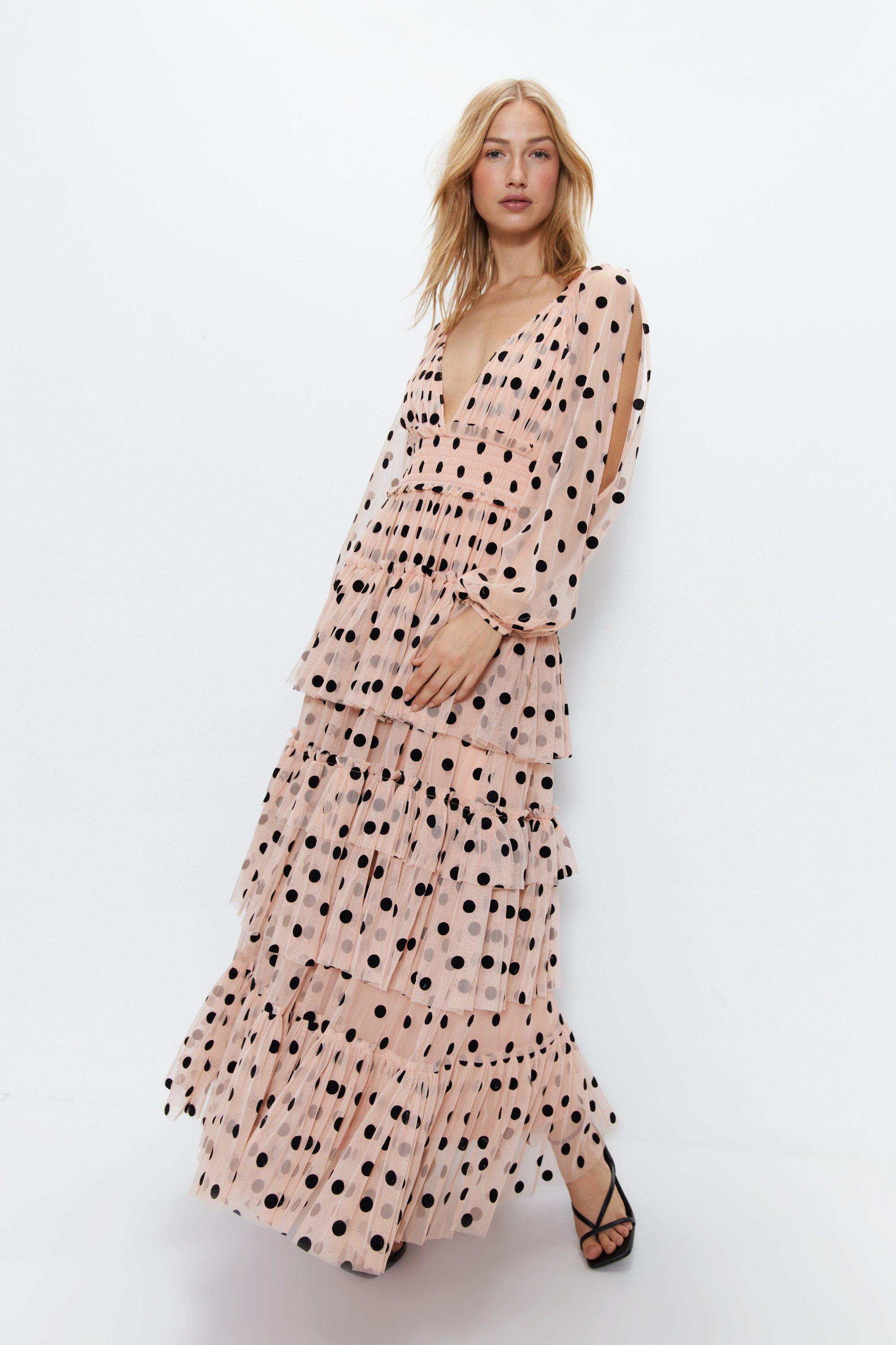 Warehouse wrap dress with online ruffles in polka dot