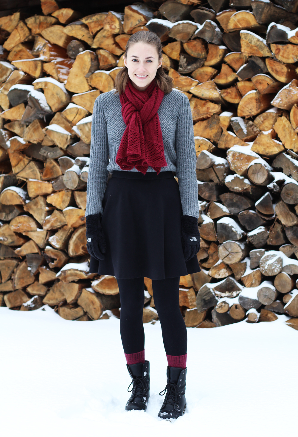 Burgundy sweater online grey skirt